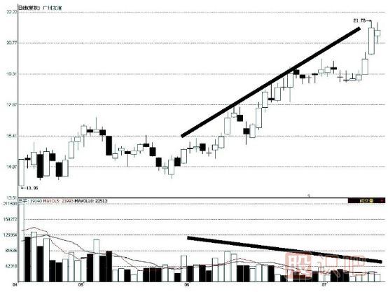 上涨中的缩量上涨时的缩量一般出现在上涨的中途和上涨的末期,出现在不同的阶段,其所具有的市场含义也不尽相同。在上涨中途出...